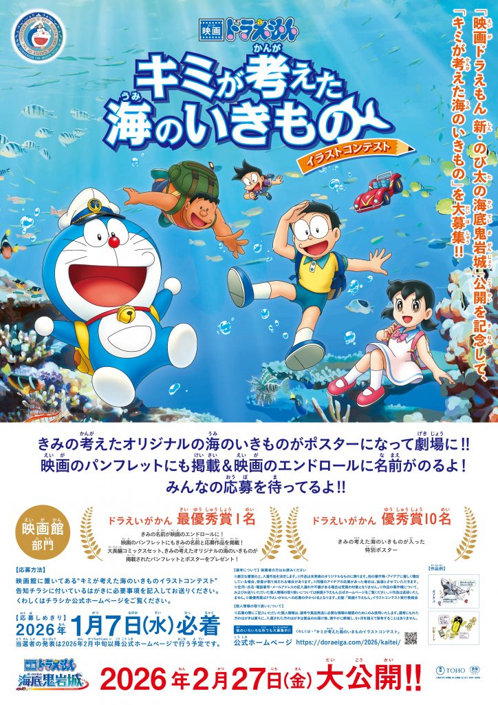 廣部 『映画ドラえもん 新・のび太の海底鬼岩城』イラストコンテスト キミが考えた海のいきものイラストコンテスト 劇場に設置されている専用の応募用紙で〈映画ドラえもん イラストコンテスト〉に応募してね! きみの考えたオリジナルの海のいきものが映画のパンフレットに登場するかも!? 詳しくは劇場のポスターまたは応募用紙をご覧ください。 (C)藤子プロ・小学館・テレビ朝日・シンエイ・ADK 2026