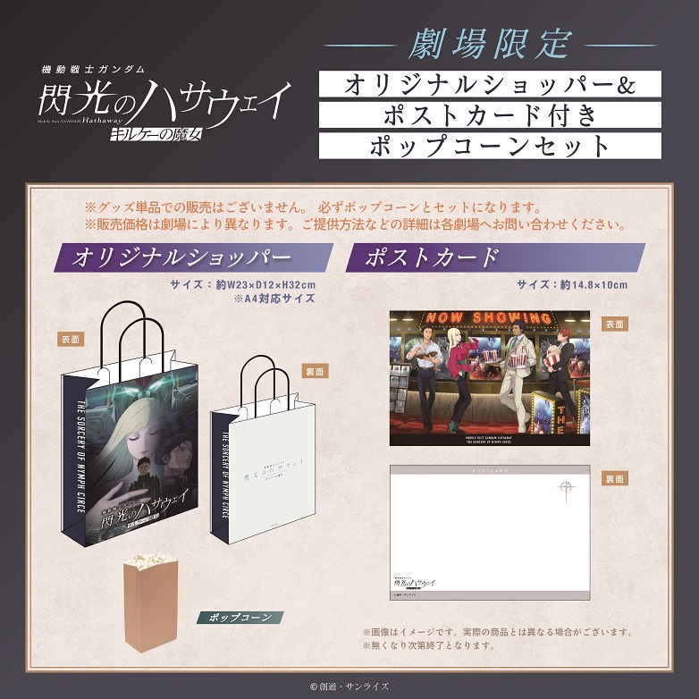 廣部 『機動戦士ガンダム 閃光のハサウェイ キルケ―の魔女』グッズ付きポップコーンセット 塩味ポップコーン(Sサイズ)付き ※劇場使用のカップにて提供いたします。 ※キャラメルポップコーンまたはカレースナックに変更の際は追加料金を頂戴いたします。 ※数量限定です。売り切れの際はご容赦ください。 ※グッズのみの販売はご遠慮ください。